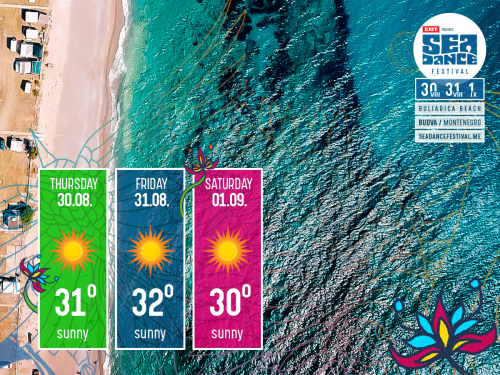 Svi koji se bave meteorološkom prognozom saglasni su u jednom – od 30. avgusta do 1. septembra posjetioce Sea Dance festivala očekuje toplo i sunčano vrijeme bez padavina, savršeno za uživanje u nastupima najvećih muzičkih zvijezda tokom festivalskih dana i noći!