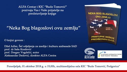 KIC “Budo Tomović” u saradnji sa Alfa centrom iz Nikšića organizuje promociju knjige “Neka Bog blagoslovi ovu zemlju” koju je prilagodio i preveo Dragan M. Vugdelić.