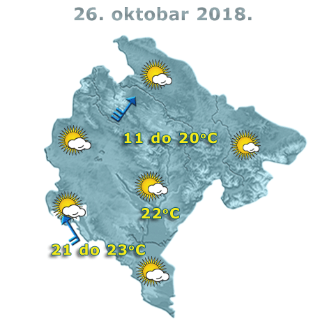 U Crnoj Gori će danas biti pretežno sunčano, uz postepeno povećanje oblačnosti, a tokom noći mjestimično kiša. Vjetar južnih smjerova, mjestimično umjeren do pojačan, u sjevernim predjelima i na primorju krajem dana i tokom noći, na udare ponegdje i veoma jak.