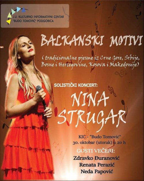 Solistički koncert crnogorske umjetnice Nine Strugar pod nazivom ,,Balkanski motivi” biće održan u organizaciji Kulturno – informativnog centra ,,Budo Tomović” u utorak, 30.oktobra, u Velikoj sali od 20 sati.