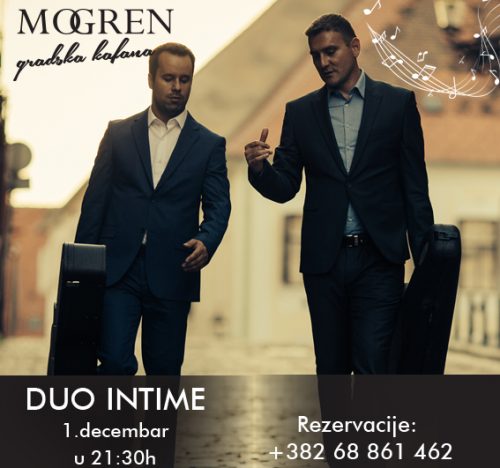 Sedmicu dana kasnije, 1. decembra u Gradskoj kafani hotela Mogren nastupiće Duo Intime – dva odlična vokala u kombinaciji sa dvije akustične gitare, svojom emocijom i muzikom osvojiće srca publike već pri prvim taktovima sjajnog repertoara.