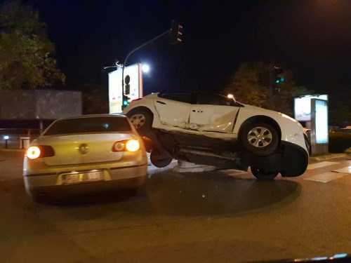 Dva automobila sudarila su se iz nepoznatih razloga, od čega je jedan završio na drugom. Na vozilima je pričinjena znatna materijalna šteta.