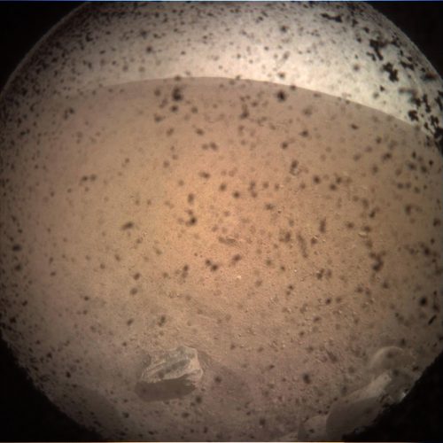 Odmah po slijetanju InSight je snimio i prvu fotografiju s Marsa te ju je poslao u središte NASA-e. Fotografija prikazuje zanimljiv pogled na planetu dok se u daljini vidi horizont. Takođe se vide dio sonde i nakupina čestica prašine na poklopcu iznad kamere.