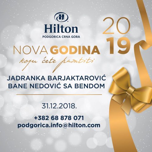 Za doček Nove godine u jedinstvenoj atmosferi hotela Hilton Podgorica Crna Gora goste će zabavljati Jadranka Barjaktarović i Bane Nedović sa bendom. Novogodišnja gala večera za jednu osobu sa pićem dobrodošlice (prosecco) je 60 eura. Iz Hiltona su najavili i