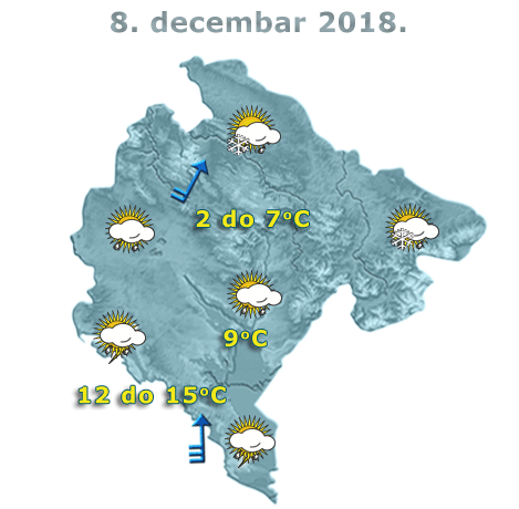 Danas će u Crnoj Gori biti umjereno do potpuno oblačno, povremeno kiša, tokom dana pljuskovi, na jugu i grmljavina, a u višim planinskim predjelima na sjeveru susnježica i snijeg. U kasnim popodnevnim satima susnježica i snijeg očekuju se u nižim predjelima na sjeveru. Krajem dana i tokom noći postepen prestanak padavina i djelimično razvedravanje. Vjetar južnih smjerova, mjestimično umjeren do pojačan, u sjevernim predjelima i na primorju ponegdje jak, u popodnevnim satima u skretanju na sjeverni i sjeveroistočni, krajem dana u pojačanju. Najviša dnevna temperatura vazduha 2 do 15 stepeni, saopšteno je iz Zavoda za hidrometeorologiju.