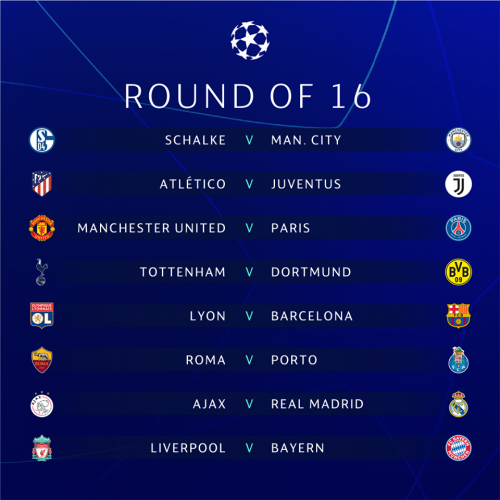 Prve utakmice osmine finala na programu su od 12, 13, 19. i 20. februara, nakon čega će se revanši igrati 5, 6, 12. i 13. marta.