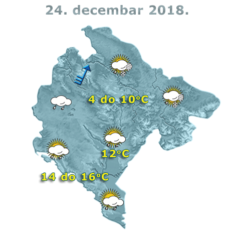 Danas će u Crnoj Gori biti umjereno do potpuno oblačno, povremeno sa kišom, ponegdje su mogući i pljuskovi sa grmljavinom. Više padavina poslijepodne i u prvom dijelu noći. Krajem dana u sjevernim predjelima kiša će postepeno preći u snijeg. Vjetar umjeren do pojačan južnih smjerova, krajem dana u sjevernim, a tokom noći i u ostalom dijelu zemlje pojačan i jak sjeverni i sjeveroistočni. Najviša dnevna temperatura vazduha 4 do 16 stepeni, najavili su iz Hidrometeorološkog zavoda Crne Gore.