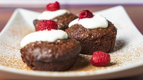 2.U drugoj šerpi se otopi čokolada sa puterom. Dodati u smjesu sa urmama, pa ubaciti i orahe. Sa strane treba umutiti bjelanca, pa lagano dodavati u čokoladnu smjesu. Kad se sjedini, prebaciti u kalupe i peći oko pola sata na 180 stepeni. Odlično ide uz smrznuti jogurt i maline.