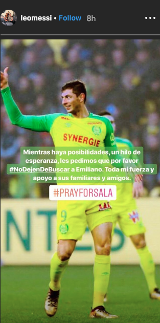 We don't want to give up, we want to hold on to hope. That's why I also wish #NoDejenDeBuscar – don't call off the search. From the start, my thoughts have been with Emiliano, his family and friends #PrayForSala