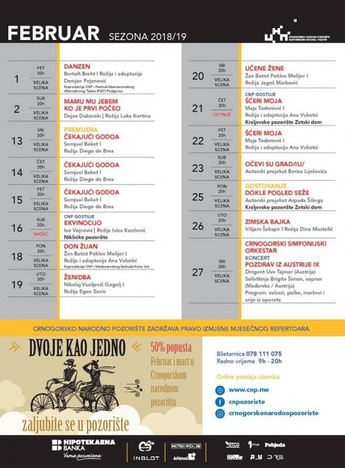 Šestu godinu zaredom, februar i mart će u Crnogorskom narodnom pozorištu biti u znaku akcije ,,Dvoje kao jedno – zaljubite se u pozorište”, koja podrazumijeva popust od 50% na ulaznice za sve programe u produkciji CNP-a. Ulaznice se mogu rezervisati i kupiti na zvaničnom web sajtu pozorišta www.ulaznice.cnp.me.