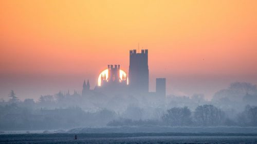 Izlazak sunca iznad katedrale u Kembridžšajru posle najhladnije noći ove godine u Velikoj Britaniji.