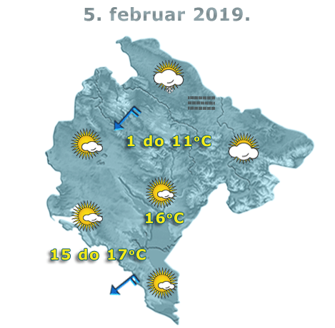 U Crnoj Gori danas će biti pretežno sunčano ili malo do umjereno oblačno, a na sjeveru umjereno do potpuno oblačno i uglavnom suvo. Vjetar sjeverni i sjeveroistočni mjestimično umjeren do pojačan, tokom noći jak. Najviša dnevna temperatura vazduha od jedan do 17 stepeni, saopšteno je iz Zavoda za hirdometeorologiju.