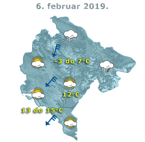 U Crnoj Gori će danas biti umjereno do potpuno oblačno, na sjeveru povremeno snijeg i susnježica, a tokom dana u nižim predjelima moguća i slaba kiša. Vjetar umjeren do jak, ponegdje na udare i veoma jak, sjeverni i sjeveroistočni. Najviša dnevna temperatura vazduha -3 do 15 stepeni, saopšteno je iz Zavoda za hidrometeorologiju.
