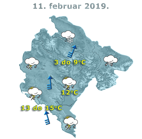 Danas će u našoj zemlji biti pretežno oblačno, u većem dijelu zemlje kišovito, povremeno pljuskovi, lokalno i grmljavina, na sjeveru, u višim planinskim predjelima, i susnježica i snijeg, a krajem dana kiša će i u nižim predjelima preći u snijeg. Tokom noći susnježica i snijeg očekuje se i dijelom u centralnim oblastima i višim planinskim predjelima na jugu. Vjetar južnih smjerova, pojačan i jak, na udare i veoma jak, u kasnim popodnevnim satima u skretanju na sjeverni i sjeveroistočni. Najviša dnevna temperatura vazduha 3 do 15 stepeni, najavili su iz Hidrometeorološkog zavoda Crne Gore.