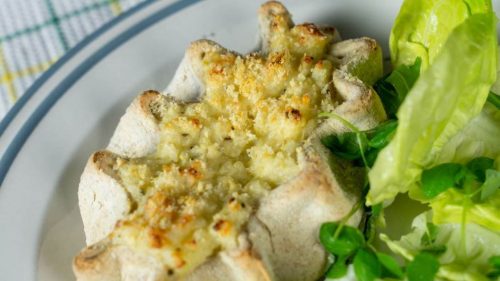 4.Na sredinu pripremljenog tijesta stavite po kašiku nadjeva, prstima odignite rubove tijesta, pospite parmezanom i pecite u rerni zagrijanoj na 180 stepeni 15-20 minuta.