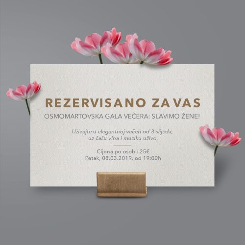 -The Dining Room, koji se nalazi na prvom spratu hotela biće mjesto na kojem ćemo dočekati sve goste koji odluče da ovaj poseban dan provedu u očaravajućoj atmosferi našeg hotela. Podgorički duo, koji čine mladi i talentovani Jovana Jokić i Filip Ćabak, će zabavljati sve prisutne u ovoj večeri posvećenoj damama. Naš izbor za Vas je večera od tri slijeda uparena sa čašom vrhunskog italijanskog vina, a na Vama je da se opredijelite za mesni ili riblji meni koji smo sa pažnjom odabrali – istakao je Saša Popović, šef kuhinje hotela CentreVille. Cijena večere koja počinje 08.03. u 19 časova iznosi 25 eura po osobi.