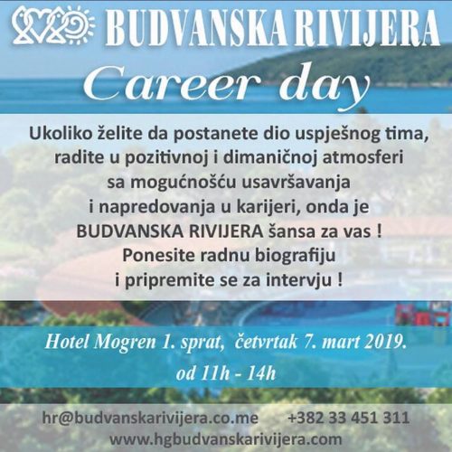 Hotelska grupa ,,Budvanska rivijera” organizuje Career Day za sve zainteresovane koji žele naći zaposlenje u najvećoj hotelskoj grupaciji u Crnoj Gori, u okviru koje posluje pet hotela: Mogren, Aleksandar i Slovenska plaža u Budvi kao i Palas i Castellastva u Petrovcu.