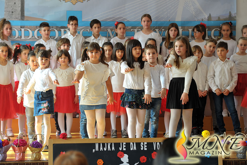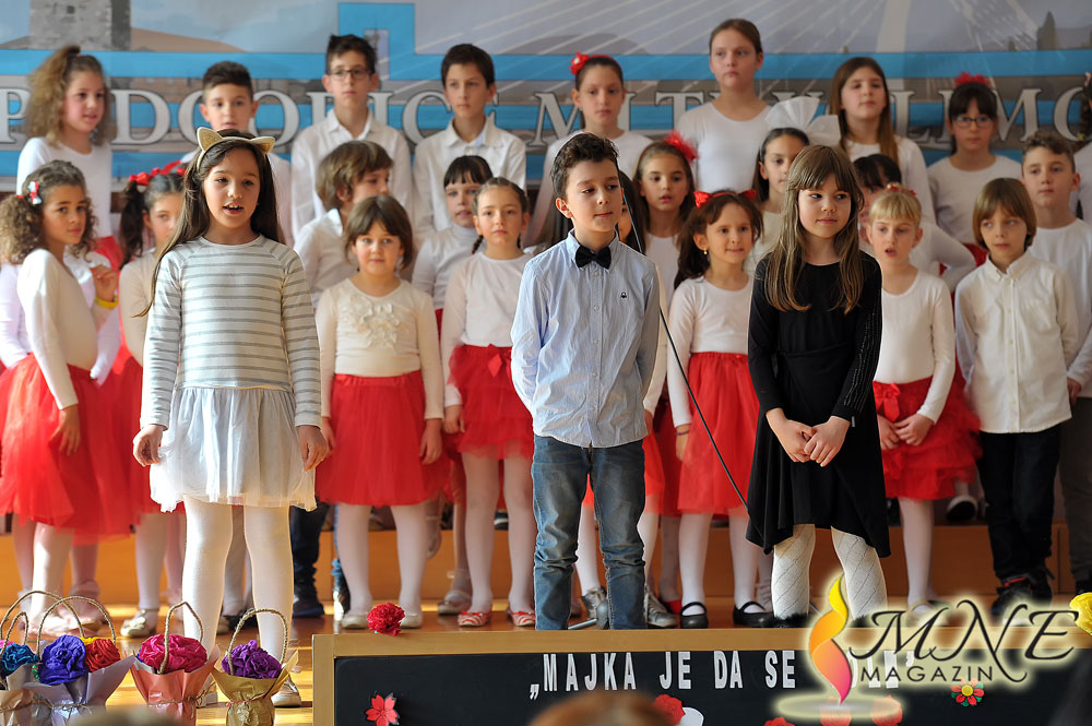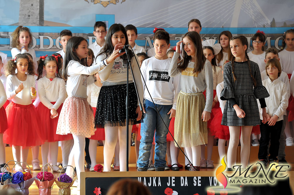 Učenici prvog i petog razreda Osnovne škole “Savo Pejanović” iz Podgorice, sa svojim učiteljicama i vaspitačicama, u susret 8. martu priredili su danas svečani program pod nazivom “Majka je da se voli”. Priredba je bila poklon majkama, i svim ženama koje brinu o njima.