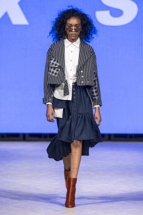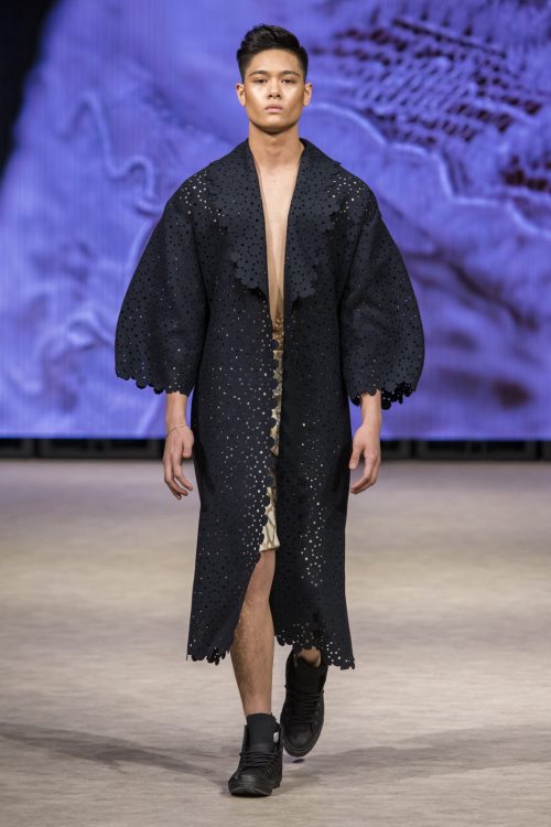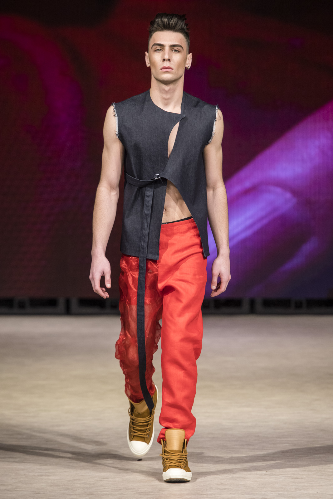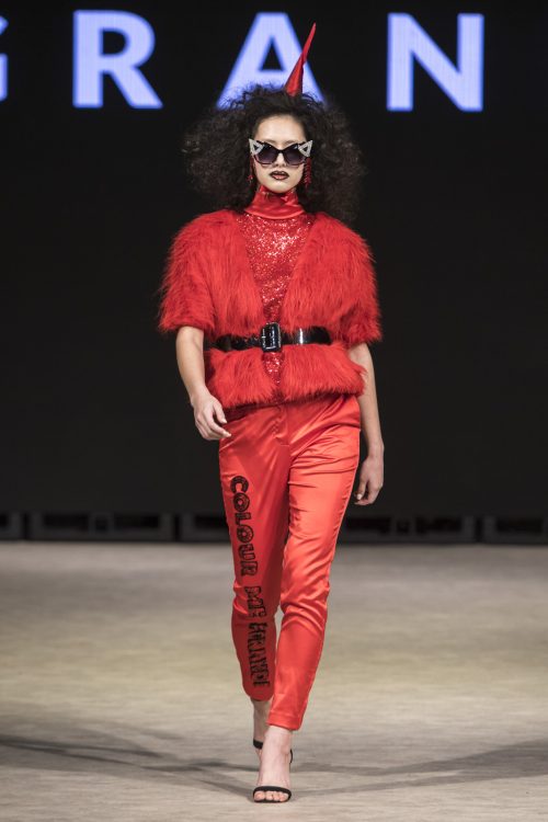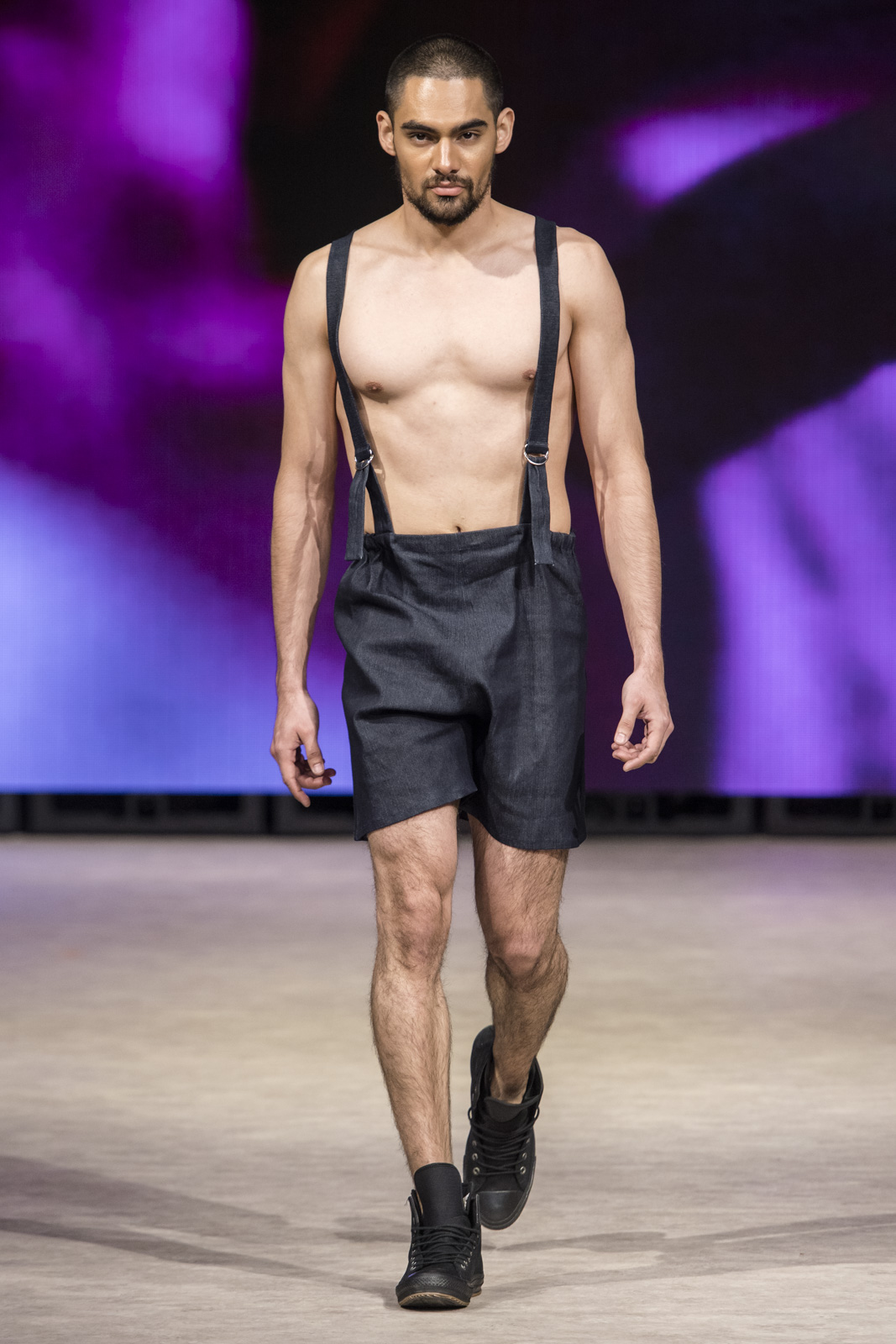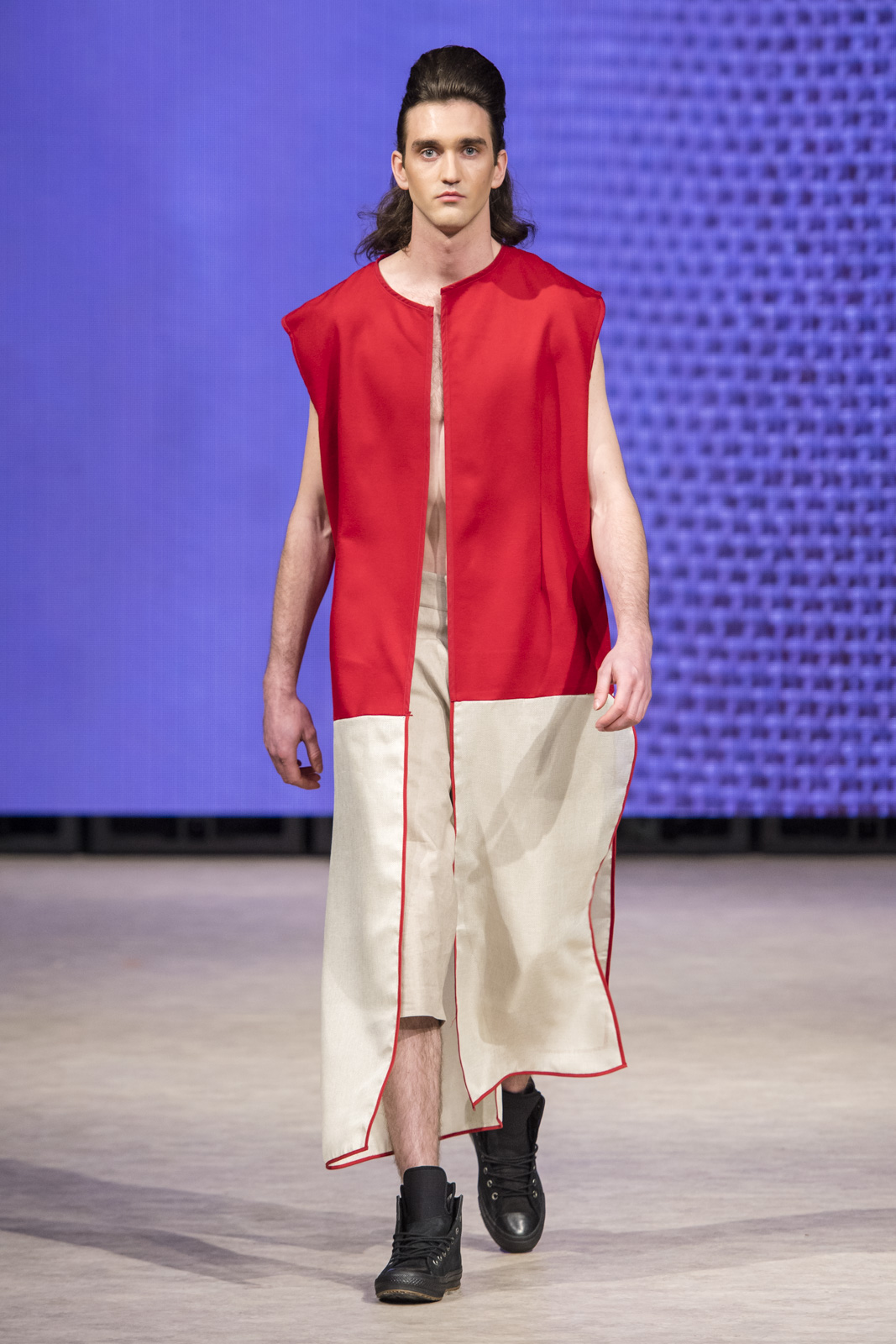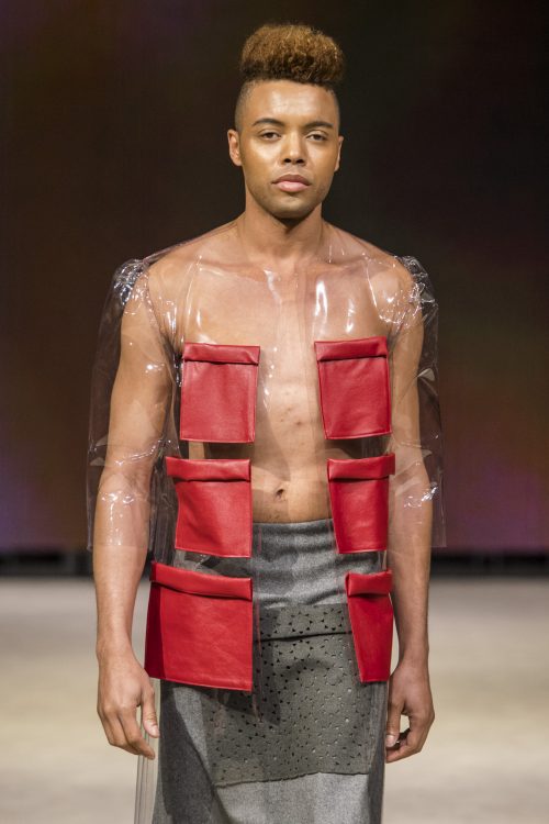 Venezuelan fashion designer Valentina Valor’s work was focused on gender fluidity, but more importantly confidence in the self with strong and provocative figures that inspire poise in the wearer through opaque materials and belted features.