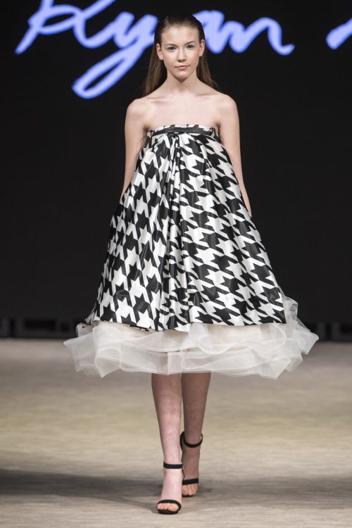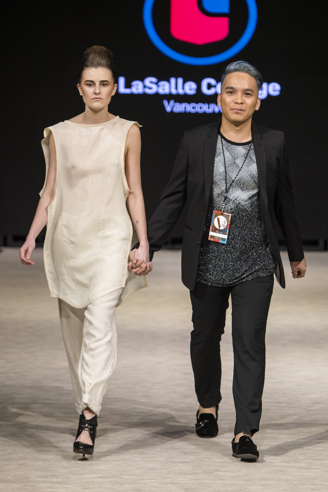 To begin the shows, LaSalle College celebrated their 10 year anniversary of showing at Vancouver Fashion Week, with three promising designers presenting collections in the theme of Taboo. Shaghayegh Tafreshi’s collection evoked striking geometric patterns, with the use of contrasting materials in lace and synthetic highlighting the intersection between Western and Persian design and her background in architecture.