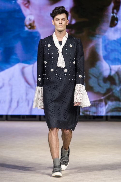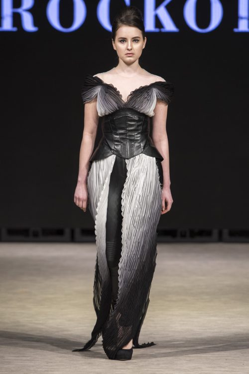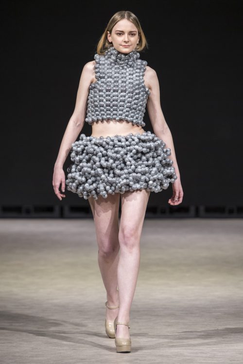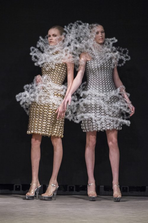 Japanese designer Emi Jingu showed off the endless artistic possibilities of balloons with her collection ‘Unlimited’. She captivated the audience with her innovative and sophisticated dresses all using the unique material of balloons. Jingu pushes artistic boundaries as she effortlessly coordinates a metallic palette of grey, bronze and gold tones while intricately layering balloons of different dimensions in such a way to create elegant couture silhouettes. Jingu’s dresses featured peplum-styles, slim bodices, and flared skirts, highlighting her extraordinary talents. The eccentric garments were complemented with sleek hairstyles, glossy makeup with ashy tones, and stilettos to encompass the chic futuristic style.