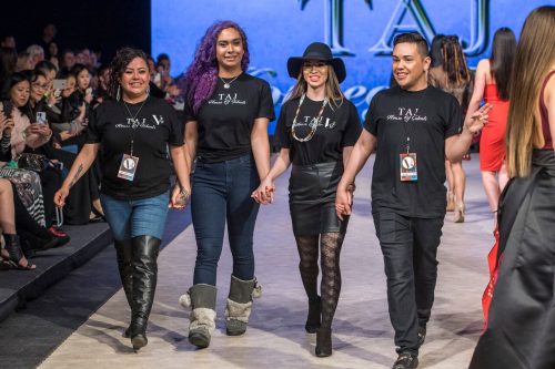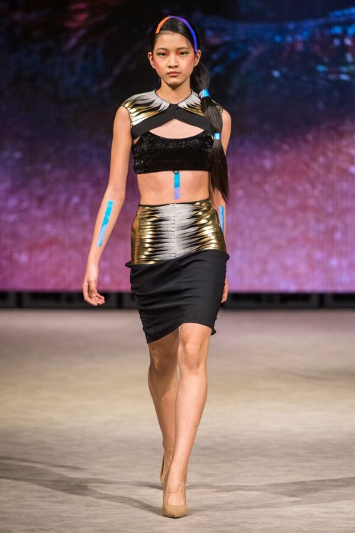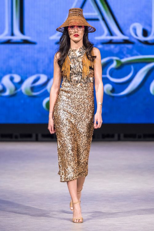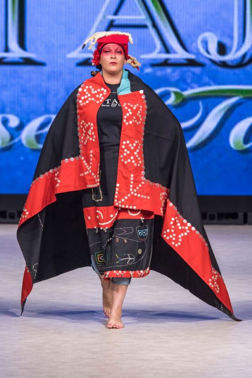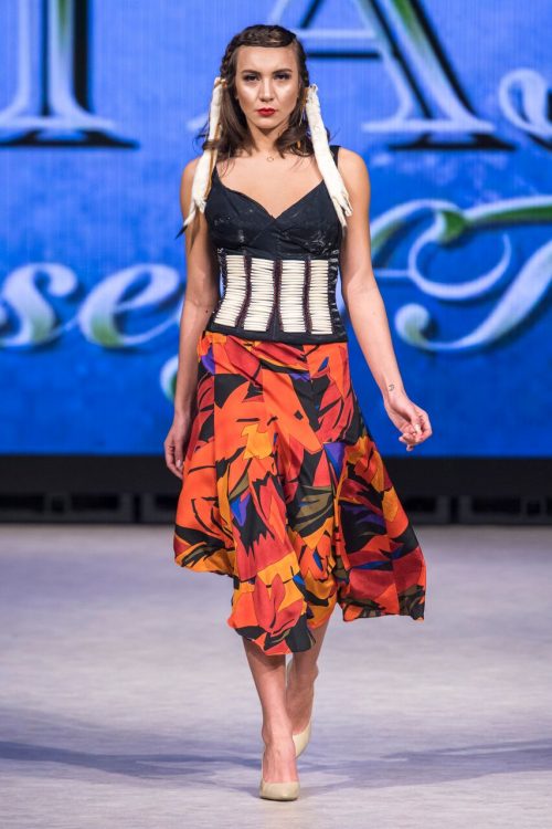 Following Melissa Yin was BC designer Tyler Alan Jacobs of the TAJ House of Talents. A member of the Squamish First Nation, Jacobs creates traditional Coast Salish wear integrated with modern fabrics and cuts. His collection moved through form-hugging black and gold pieces with blue and silver accents to flowing cape silhouettes in black and cherry. Looks were completed with ombre yellow-red face markings and berry-red lips. Hairwas left loose and accented with braids and leather or fur detail. Tyler highlighted his work with traditional First Nations motifs beaded ornately on dresses and skirts. The show concluded in dramatic fashion, as the final model strode down the runway and untied her motif-accented red cape, approaching the cameras with the textile around her waist.