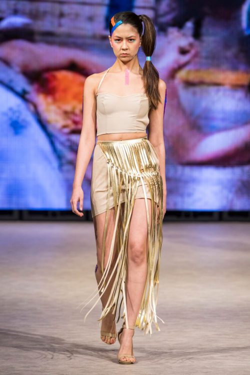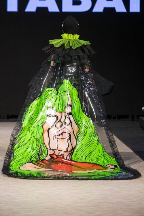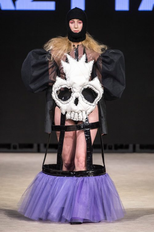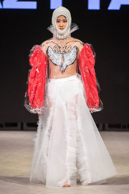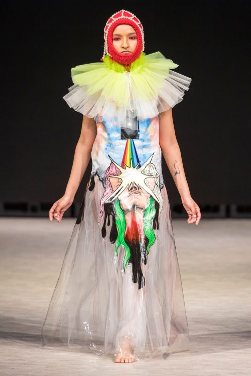 Seventeen-year-old Vancouver-based designer Ming Lim from Crazy baby closed off Tuesday’s events with a memorable showing of her collection ,,Sophrosyne” exploring the idea of self-peace. This work is said to have surfaced from a period of self-realization and growth in Ming’s life, and features avant-garde looks that grab the attention of the viewer and convey a captivating message about the designer. Fantasy imagery is consistent throughout the line, as is the layering of contrasting materials with edgy accessories. Transparent materials stitched next to flowing legwear leave the model equally concealed and revealed, suggesting a feeling of veiled confusion. A mural-like printed train with an image of a heart being held by a weeping figure closed out a truly provocative show by the remarkable young designer.