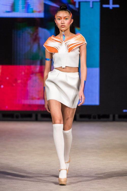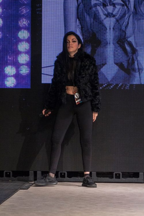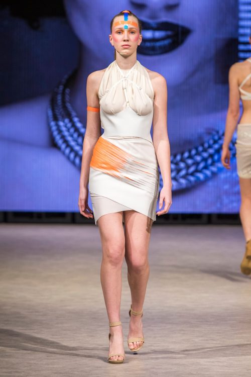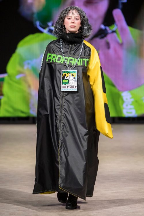 Profanity by LillzKillz lived up to the name. The scandalous collection by BC based, 21 year old designer featured a range of differently sized models who descended on the runway in attire unlike anything else seen this week. Drawing from the fashion culture of extreme snow sports, items included park rat oversized hoodies juxtaposed with tight mini dresses that, on one occasion, exposed the entire back and backside of the model. LillzKillz maintained no regard for gender roles, placing male models in classic, black stilettos and female models in snow boots. An electric palette of bright orange, yellow and a graphic design that harkened back to 90s snowboarding culture fought for attention with an array of opaque, puffy and stark white fur fabrics. The result was eccentric and, need we say it, profane.