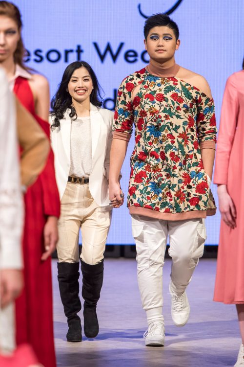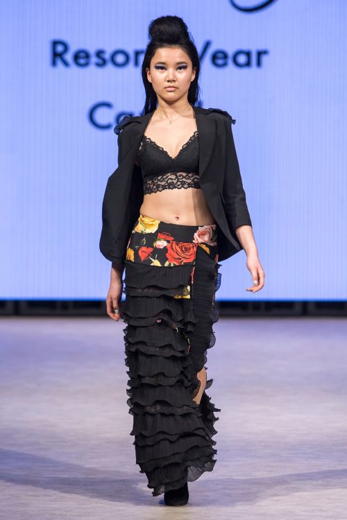 The second day of Vancouver Fashion Week opened with ,,Celestial”, a resort-wear collection by Melissa Yin of Mel Elegance. Melissa is Chinese-Canadian and brings a multicultural aesthetic and minimalist comfort to luxury resort-wear. Inspired by a summer spent in Alaska Delaney National Park, Melissa’s designs are defined by flowing silhouettes and warm floral patterns in silk and linen. The sounds and sights of Alaskan wildlife are reflected through colour and detail in a collection that transitions steadily from black and floral ruffles to white lace. Rounding out the tone of the show were floor-length dresses in soft pinks and bright reds. Thoroughly accessorized, outfits were completed with bright blue and pink straw beach bags.