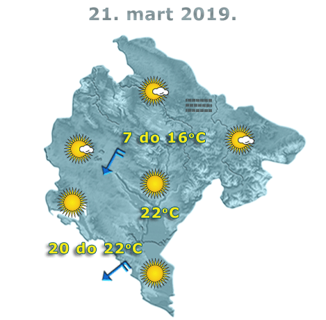 U južnim i centralnim predjelima Crne Gore, danas će biti pretežno sunčano uz lokalno malu do umjerenu oblačnost. Na sjeveru promjenljivo oblačno. Vjetar mjestimično umjeren do jak, ponegdje na udare i veoma jak, sjeverni i sjeveroistočni. Najviša dnevna temperatura vazduha od sedam do 22 stepena, saopšteno je iz Zavoda za hidrometeorologiju.