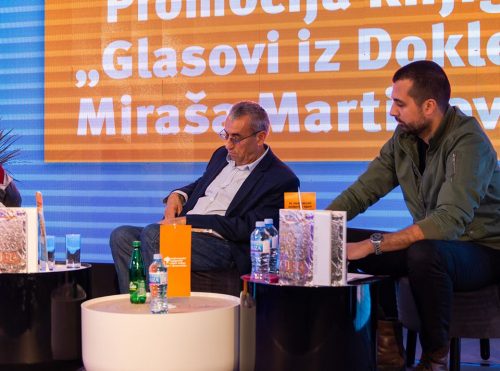 Roman ,,Glasovi iz Doklee” Miraša Martinovića na Sajmu su predstavili profesor književnosti i književna kritičarka Božena Jelušić, književnik Nikola Nikolić i autor.