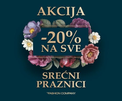 Praznična euforija i kraći proljećni odmor idealna su prilika za uživanje u šopingu i obnavljanju vašeg garderobera. Atraktivni komadi odjeće, obuće i aksesoara po posljednjim modnim trendovima nikada nisu bili pristupačniji. U prodavnicama Fashion Company vas očekuje praznična akcija u okviru koje dobijate 20 odsto popusta na kolekciju proljeće-ljeto 2019. uključujući artikle koji su dio mid season sale ponude (sniženi do 30 odsto). Popusti se obračunavaju na kasi.