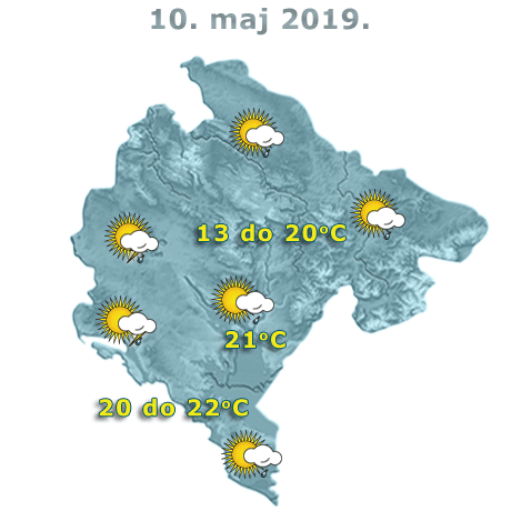 Danas će u našoj zemlji biti promjenljivo oblačno sa sunčanim intervalima, uz uslove ponegdje za slabu kišu, a moguća je i rijetka pojava kratkotrajnog pljuska i grmljavine. Vjetar slab do umjeren i promjenljiv, ujutru ponegdje na primorju pojačan, južni i istočni. Najviša dnevna temperatura vazduha 13 do 23 stepena.