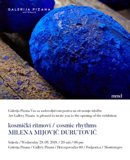 Izložba umjetnice Milene Mijović Durutović, pod nazivom “Kosmički ritmovi”, biće otvorena u srijedu, 29. maja, sa početkom u 20 časova u galeriji Pizana u Podgorici.