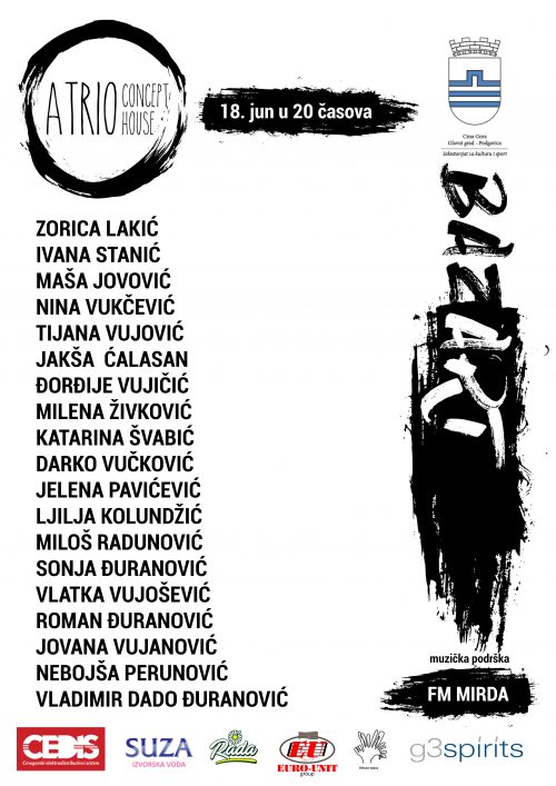 Bazar Art, jedno od najmasovnijih okupljanja crnogorskih umjetnika u novijoj istoriji naše države, održaće se sjutra, 18. juna u multimedijalnom kulturnom centru Atrio Concept House, u Ulici Miljana Vukova 39 u Podgorici, saopštili su organizatori.