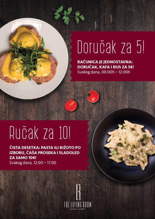 Nakon višemjesečne ponude i na stotine zadovoljnih gostiju, The Living Room će i u naredna dva mjeseca biti mjesto na kojem se ruča fenomenalno. Naime, tokom cijelog ljeta gosti će biti u prilici da uživaju u perfektnom ručku za samo 10 eura. Čaša proseka i sladoled biće pravo osvježenje nakon glavnog jela u vrelim ljetnjim danima, a kao glavno jelo gosti se mogu odlučiti za bilo koju pastu, rižoto ili obrok salatu sa aktuelnog menija.