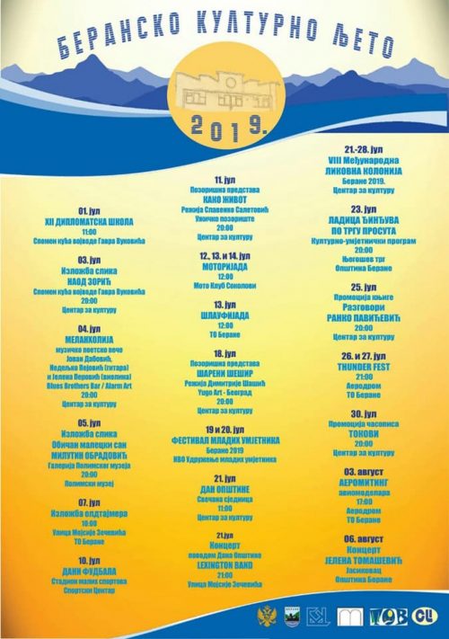 Tradicionalna manifestacija „Beransko kulturno ljeto“, u okviru koje je za posjetioce pripremljen bogat program, počeće u ponedeljak 1. jula – otvaranjem dvanaeste Ljetnje diplomatske škole „Gavro Vuković“, a završiće se 6. avgusta – koncertom pop pjevačice Jelene Tomašević u amfiteatru spomenika na Jasikovcu.
