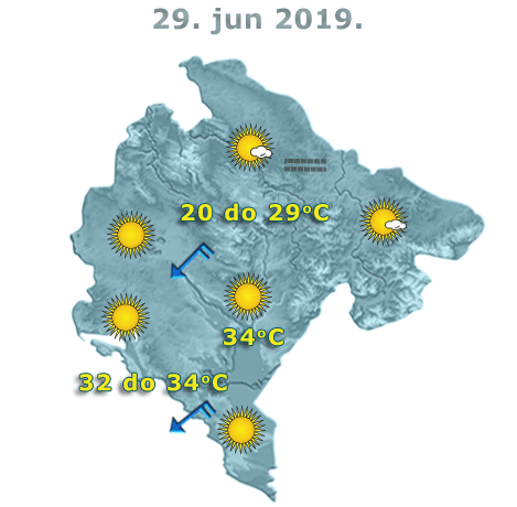 Danas će u Crnoj Gori biti pretežno sunčano i toplo. Na sjeveru tokom jutra kratkotrajno magla ili niska oblačnost. Vjetar sjevernih smjerova, umjeren do jak, tokom dana će oslabiti. Najviša dnevna temperatura vazduha 20 do 34 stepena.