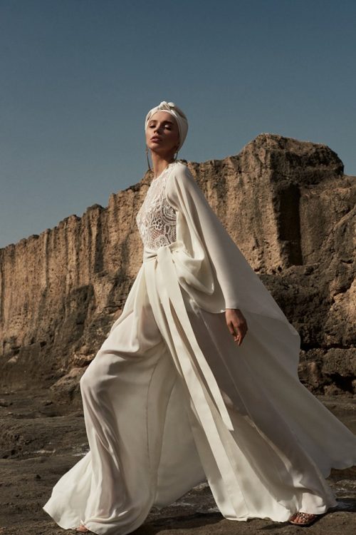 Slapovi bijele ponajviše, ali posebnu napomenu zaslužuje dio kolekcije sa motivima koji izgledaju poput ornamentike na otomanskim pločicama. A to obožavam. Tu besprijekornu komplikaciju koja samo izgleda kao nešto ovlaš slagano, ali nije. Geometrija i floral uzorak su savršen par svakako, ali lako je to reći ako zamislite jedan kvadrat sa kockicama i pored kvadrat sa cvijećem, i da baš se slaže. Ali složiti to dvoje, unakrsno, podijeliti u sitne segmente, revere, šavove, ušitke, pojas, rukave… složiti toliko komplikovan mozaik, koji izgleda tako perfektno.