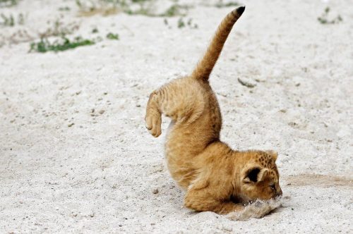Mladunče berberskog lava skače po pijesku u zoološkom vrtu u češkom gradu Dvur Kralove.