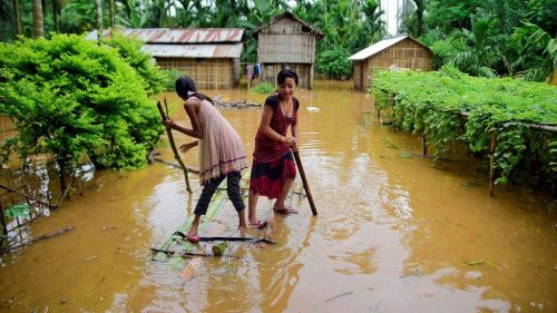 Djevojke koriste improvizovani splav kako bi se kretale po polavljenom selu na sjevero-istoku Indije.