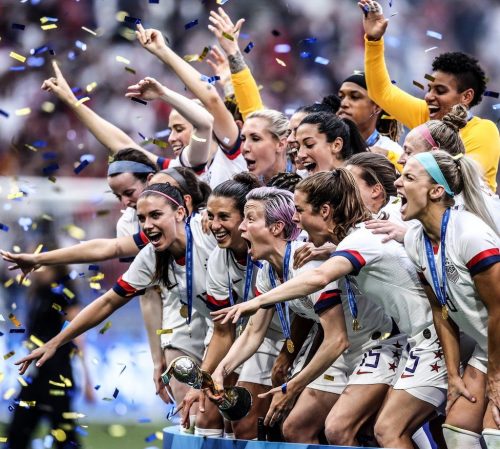 Megan Rapino, fudbalerka Sjedinjenih Američkih Država, podiže trofej nakon što je njen tim osvojio prvo mjesto na Svetskom prvenstvu za žene u Francusko.