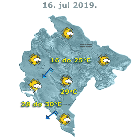 U Crnoj Gori danas će biti promjenljivo oblačno sa sunčanim intervalima ali i uslovima za ponegdje kratkotrajnu kišu i grmljavinu, tokom prvog dijela dana. Vjetar mjestimično umjeren, u jutarnjim i noćnim satima i pojačan, sjeverni i sjeveroistočni. Najviša dnevna temperatura vazduha 16 do 30 stepeni, saopšteno je iz Zavoda za hidrometeorologiju.