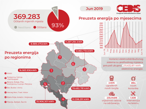 Prethodnog mjeseca je očitano ukupno 369.283 mjernih mjesta, ili 93 odsto od ukupnog broja (neočitana mjerna mjesta nalaze se u objektima koji nijesu stalno nastanjeni). Procenat očitanosti na mjernim mjestima koja su opremljena novim, elektronskim brojilima je 99 odsto.