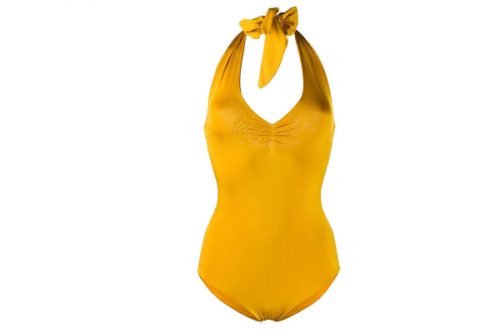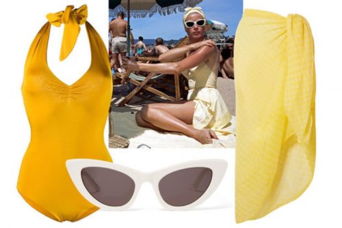 Naočare sa bijelim okvirom, jednodjelni kupaći kostim, pareo i traka za glavu u svijetložutoj boji.