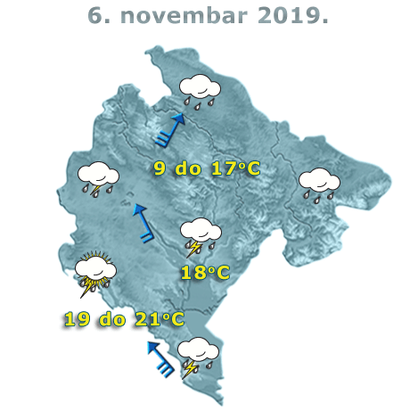 U Crnoj Gori danas će biti pretežno oblačno i kišovito, povremeno pljuskovi i grmljavina. Mjestimično se očekuju umjerene do obilne količine padavina. Vjetar južnih smjerova, umjeren do jak, na udare ponegdje i veoma jak, u popodnevnim satima će postepeno slabiti. Najviša dnevna temperatura vazduha od devet do 21 stepen, saopšteno je iz Zavoda za hidrometeorologiju.