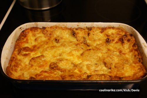 3.Pecite 10 minuta na 200 stepeni, pa izvadite posudu i jelo prelijte jajima i mlijekom, i onda pecite još 30 minuta.
