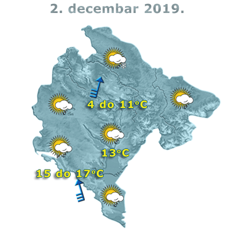U Crnoj Gori danas će biti umjereno do potpuno oblačno, uglavnom od sredine dana mjestimično kiša, krajem dana i tokom noći u južnim i centralnim predjelima i pljuskovi i grmljavina a u višim predjelima na sjeveru, kiša će postepeno preći u susnježicu i snijeg. Vjetar povremeno umjeren do jak, u sjevernim predjelima i na primorju, na udare i veoma jak, južnih smjerova, krajem dana će slabiti. Najviša dnevna temperatura vazduha od četiri do 17 stepeni, saopšteno je iz Zavoda za hidrometeorologiju.
