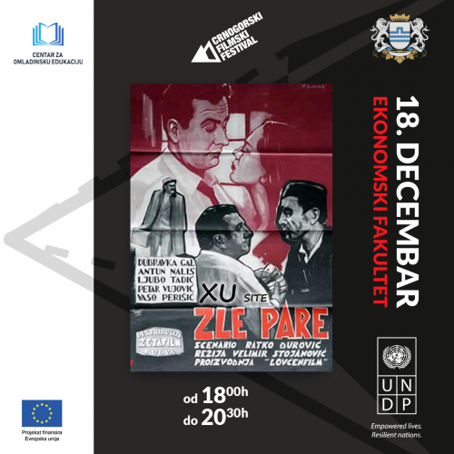 Kultni igrani film ,,Zle pare“ u režiji Velimira Stojanovića biće prikazan danas – u srijedu, 18. decembra na Ekonomskom fakultetu Univerziteta Crne Gore s početkom u 18 sati. Projekcija filma je besplatna i organizuje se u okviru projekta #PodgoricaMovieTime. Moderator će biti Vuk Perović, urednik filmskog i serijskog programa RTCG i umjetnički direktor Underhill festivala.