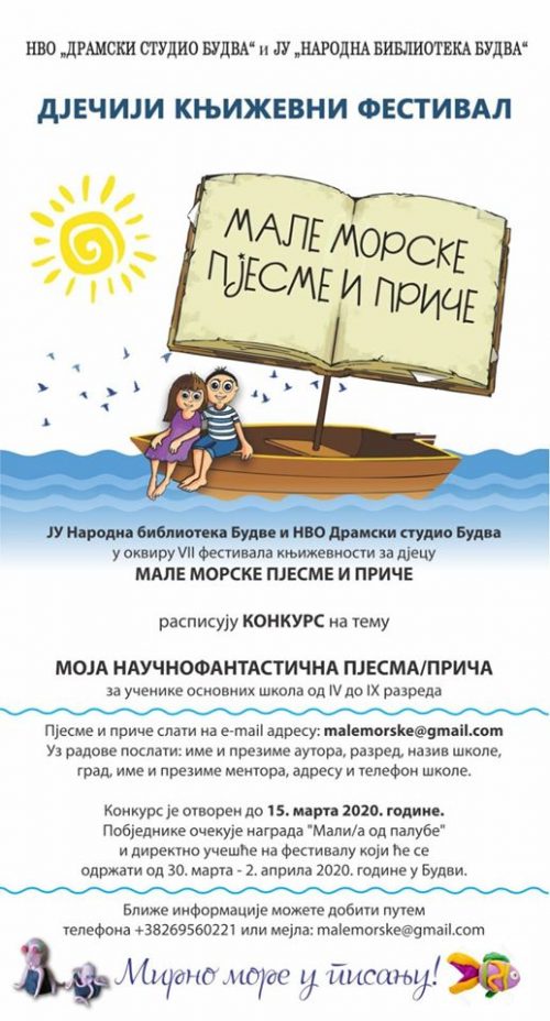 NVO Dramski studio Budva i JU Narodna biblioteka Budva, u okviru sedmog po redu festivala književnosti za djecu “Male morske pjesme i priče” koji će se održati od 30. marta do 2. aprila, raspisuju konkurs na temu “Moja naučnofantastična pjesma/priča” za učenike osnovnih škola od IV do IX razreda.